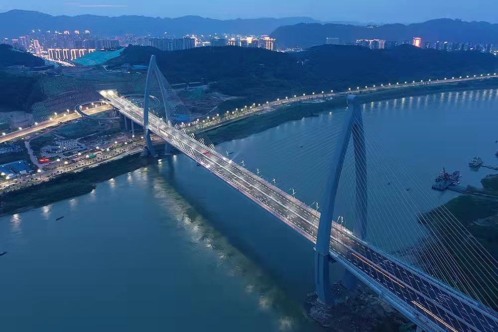 四川宜賓鹽坪壩長江大橋是宜賓市城市內(nèi)環(huán)線的重要跨江節(jié)點(diǎn)工程,也是宜賓目前體量最大的橋梁。索塔是全國首次采用的“魚躍長江”造型,猶如一條躍出水面、向上飛騰的江魚。